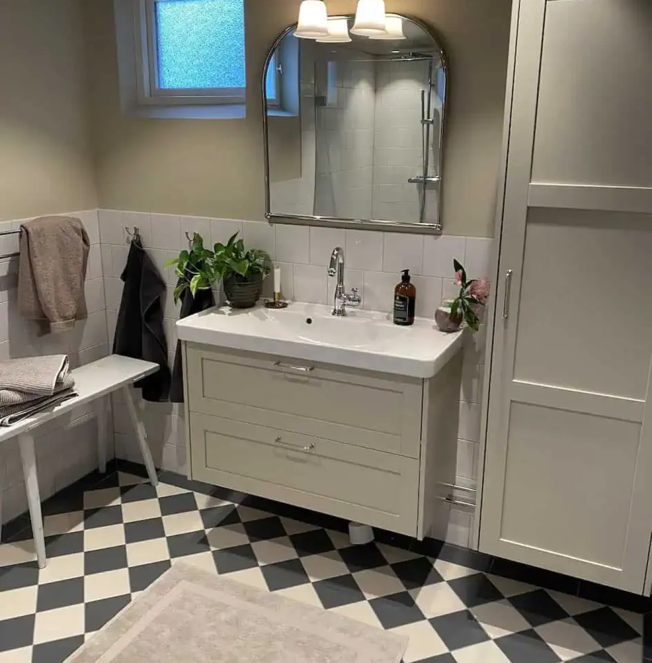 Ett retro badrum tar dig tillbaka i tiden med sin charmiga estetik och nostalgiska detaljer. Den här stilen hämtar inspiration från 50-tals badrum och karakteriserar schackrutigt golv med vita och kulör färg i storlek 15×15. Även Hexagon klinkers var vanligt på golv i 50-tals badrum. Väggarna var ofta kaklade med vita plattor i storlek 15×15 eller halvkaklade med målade väggar upptill i samma kulör som golvet.